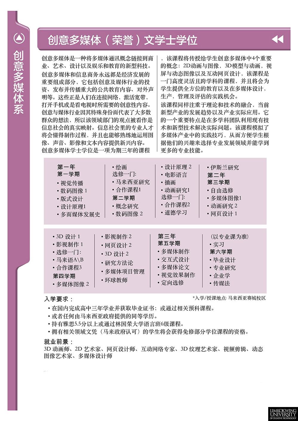 创意多媒体(荣誉)学士课程为学生提供创意多媒体的四个主要组成部分的全面知识:2D动画和成像,3D建模和动画,视频和运动图形,以及交互式网页设计。这是一个高度通用的,多学科的方案,集中在多媒体设计,制作,管理和评价的原则和实践。